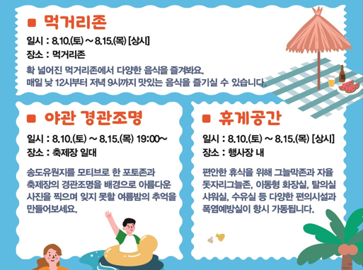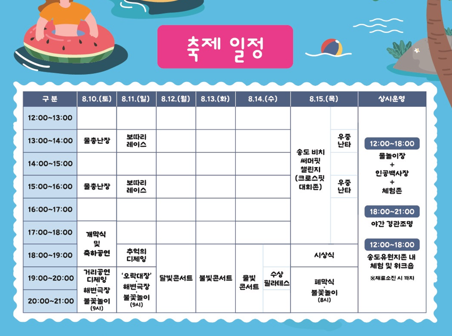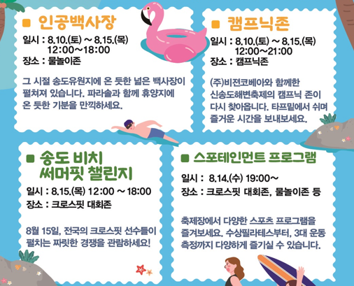그럼 모두 올여름 송도해변축제에서 만나요! 혹시 저랑 마주치게 되면 인사해 주세요. 아마 인공백사장 파라솔 아래에서 아이들 모래놀이 하는 걸 지켜보고 있을 거예요. 😊