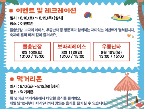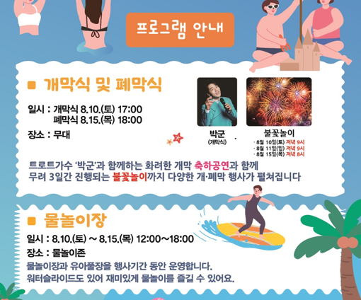 여름 축제다 보니까 폭염대비시설이 준비되어 있지만, 개인적으로도 모자나 선크림을 꼭 챙기세요. 물놀이 준비물(수영복, 수건, 여벌옷)도 잊지 마시고요!