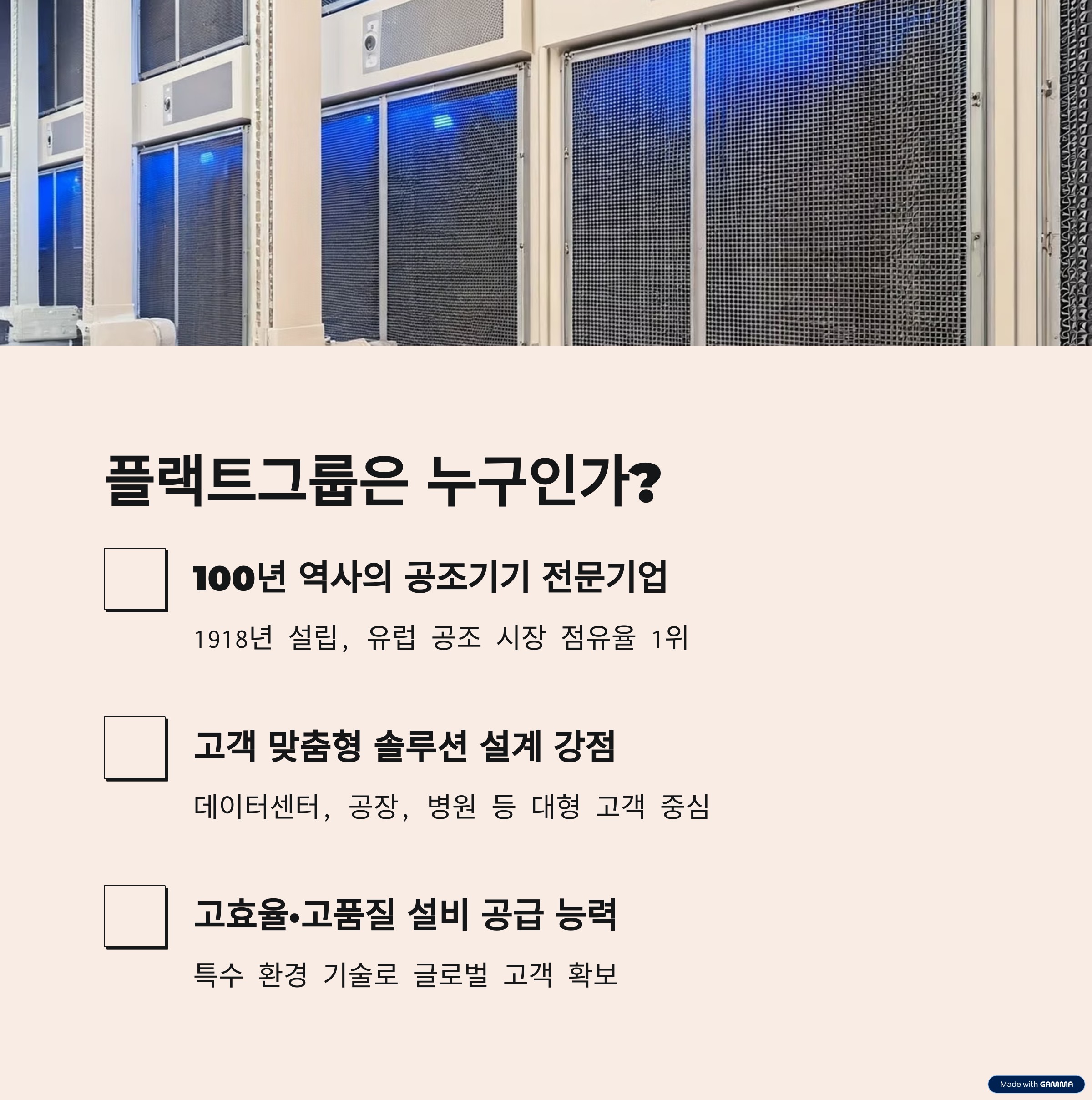 플랙트그룹(FläktGroup)은 100년 이상의 역사와 기술력을 가진 유럽 최대 HVAC(냉난방공조) 기업입니다. 2016년 스웨덴의 '플랙트우즈'와 독일의 '덴코하펠'이 합병해 탄생했으며, 약 1,372명의 직원을 보유하고 있습니다. 주요 사업 분야는 데이터센터, 박물관, 공항, 대형병원 등 다양한 시설에 고품질·고효율 공조 설비를 공급하는 것이며, 특히 데이터센터 냉각 분야에서 두각을 나타내고 있습니다. 2022년 기준 매출은 약 6억5000만 유로(약 1조300억원) 수준입니다.