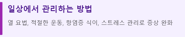 - 생활습관 개선: 항염증 식이, 규칙적인 운동